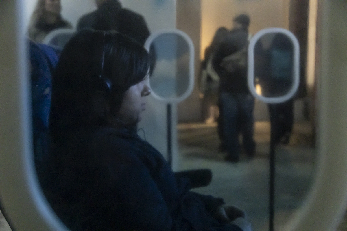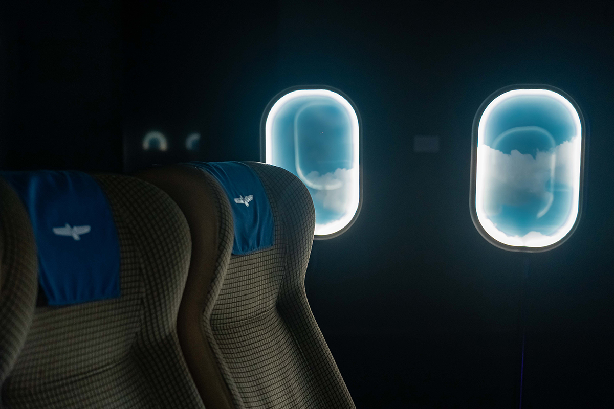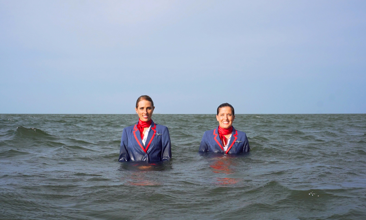 A group of flight attendants insists on courtesy, performing a mechanical ritual amid landscapes that feel both dystopian and real.