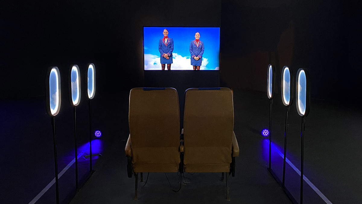 Un grupo de azafatas insiste en la cordialidad, desplegando un ritual mecánico en medio de escenarios entre distópicos y reales.